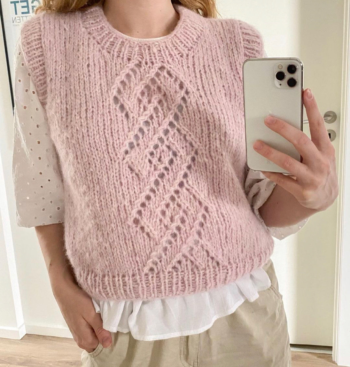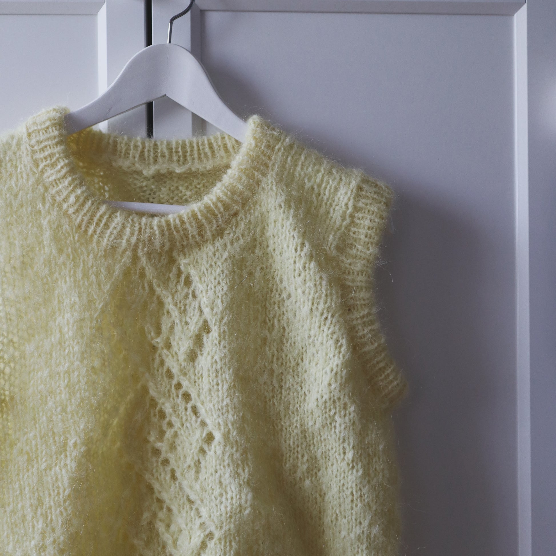 This slipover is knitted from top to bottom. Knit the back piece back and forth, and then knit the left and right shoulder onto the pack piece cast-on edge. Then finish knitting the front piece back and forth and finish knitting the body around. Knit the neckline and the armhole edges at the end.